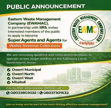 Eastern Waste Management Company (EWAMAC), in partnership with BIR, invites interested members of the public to apply to become Super Agents and Agents for Wallet Revenue Collections.